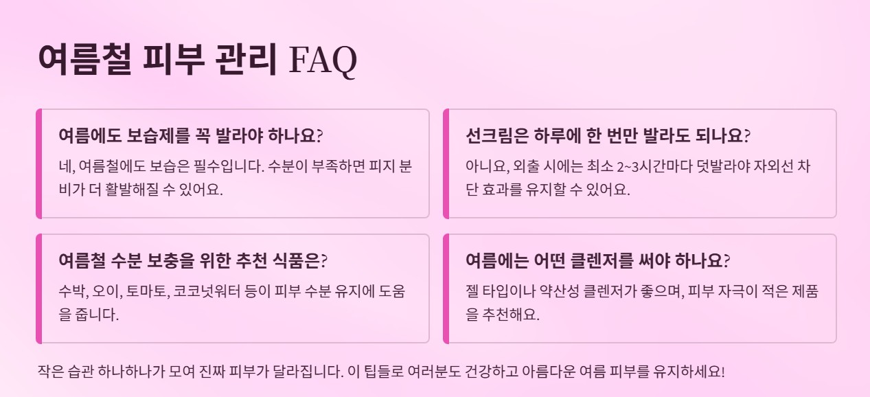여름철 피부 관리, 어렵게만 느껴졌다면 이제 조금은 자신감이 생기셨을 거라 믿어요. 사실 저도 예전엔 트러블에 속수무책이었는데, 작은 습관 하나하나가 모여 진짜 피부가 달라졌다는 걸 느꼈거든요. 이 글이 여러분께도 그런 작은 변화를 가져다줄 수 있길 바라요. 혹시 본인만의 여름 피부 꿀팁이 있다면 댓글로 공유해주세요! 같이 더 예뻐지고, 더 건강해져 봐요 :)