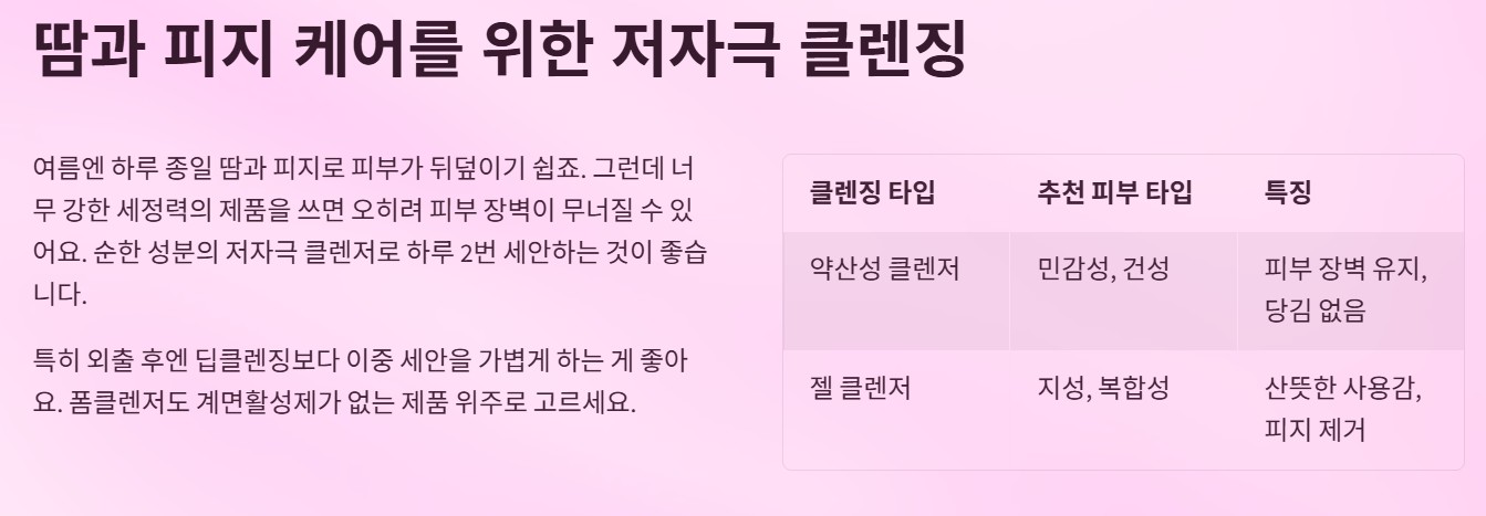 여름엔 하루 종일 땀과 피지로 피부가 뒤덮이기 쉽죠. 그런데 너무 강한 세정력의 제품을 쓰면 오히려 피부 장벽이 무너질 수 있어요. 그래서 저는 순한 성분의 저자극 클렌저로 하루 2번 세안하는 걸 추천드려요. 특히 외출 후엔 딥클렌징보다 이중 세안을 가볍게 하는 게 좋아요. 폼클렌저도 계면활성제가 없는 제품 위주로 고르고 있어요.